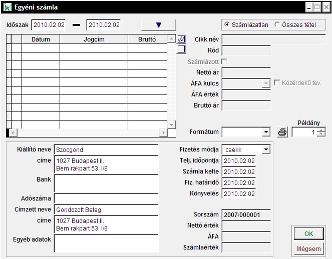 A megadott időszak egyéni kiadásairól készíthetünk számlát ebben a menüpontban.