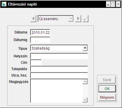 Minden személy, minden egyes eltávozása külön rögzíthető. Megadható az esemény időintervalluma, a típusa, helyszíne, valamint megjegyzést is rögzíthetünk. A 'Töröl' gombbal tudunk már meglévő eltávozást törölni. Az 'OK' gombbal zárjuk be az ablakot az adatok tárolásához.
