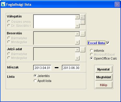 Kiválaszthatjuk, hogy a listát hagyományos vagy - amennyiben a számítógépre telepítve van - Microsoft Excel/OpenOffice Calc formátumban készítse el a program. Ehhez tegyünk pipát az Excel lista mezőbe. Az infomIx kapcsoló választása esetén a 'Megtekint' gombbal képernyőre, míg a 'Nyomtat' gomb segítségével nyomtatóra küldhetjük a listát. Microsoft Excel/OpenOffice Calc formátum esetén a 'Megtekint' gomb megnyomása után tetszőleges helyre menthetjük a listát.