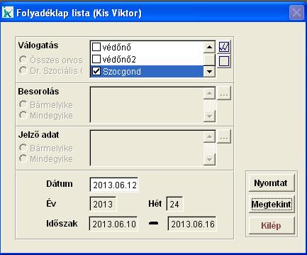 A listázóval a heti összesítő folyadék fogyasztási/ürítési kimutatást készíthetjük el, amit a Folyadéklap menüpont segítségével rögzítettünk.