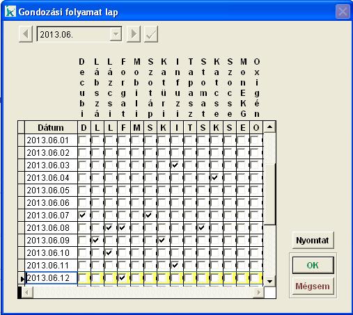 Ezzel a funkcióval az ápoltaknak nyújtott napi tevékenységeket rögzíthetjük. Elég csak bepipálni az adott tevékenységet a megfelelő nap rubrikájába, pl. forgatás, decubi kezelés, infúzió, stb. Az így rögzített adatokról havi kimutatást készíthetünk