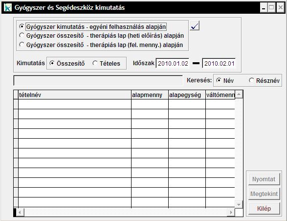 Ebben amenüpontban Gyógyszer és Segédeszköz kimutatásokat tudunk készíteni. Először válasszuk ki, hogy milyen kimutatást/összesítőt szeretnénk készíteni (egyéni felhasználás választása esetén megadhatjuk az 'Időszak'-ot), majd nyomjuk meg a gombot. A 'Kimutatás' mezőben megadhatjuk, hogy tételesen, vagy összesített formában kérjük a listát. A 'Keresés' mezőben megadhatjuk, hogy Név illetve Résznév szerint akarunk keresni a tételek között.