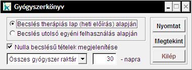 Ezen menüpont segítségével becslést készíthetünk a kiválaszottt raktárra vonatkozóan, hogy mennyi ideig tart a készlete. A becslés tetszőleges 'napra' készíthető, valamint kérhető a therápiás lap (heti előírás) alapján, valamint az utolsó egyéni felhasználás alapján. Beállítható, hogy a nulla becslésű tételek is megjelenjenek.