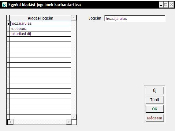 Az egyéni kiadási jogcímeket tarthatjuk kaban ebben a menüpontban. Az 'Új' gomb megnyomásával tudunk új jogcímet felvenni a készletbe, melynek nevét a 'Jogcím' mezőben kell megadnunk. A töröl gomb segítségével tudunk már meglévő jogcímet törölni. Az 'OK' gombbal zárjuk be az ablakot az adatok tárolásához. |