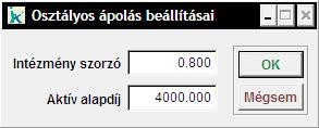 Az 'Intézményi szorzó'-t és a 'Aktív napi alapdíj' értékét tudjuk megadni ebben a menüpontban. Az 'OK' gombbal tároljuk el az adatokat.