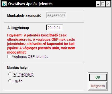A jelentés készíthető csak ellenőrzésre is, ha a 'Végleges OEP jelentést' bekapcsoljuk, akkor utána már nem módosíthatunk az adatokon. A jelentés kérhető floppyra, vagy egyéb helyre. 'Egyéb hely' esetén a gomb segítségével tudjuk kitallózni a jelentés elkészítésének helyét.