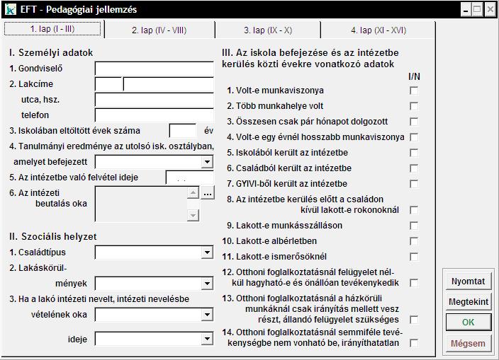 A menüpont 4 részből (lapoból) áll, értelemszerűen töltsük ki az adatokat, majd