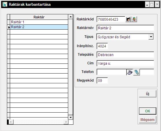 Ebben a menüpontban tudjuk raktárainkat karbantartani. Új raktár felvételéhez kattintsunk az 'Új' gombra, majd adjuk meg a raktár adatait. A raktár köthető személyhez ( gomb), valamint szervezethez ( gomb). Ha a gondozotthoz már van hozzárendelve raktár és mi egy újat szeretnénk hozzárendelni, akkor a program egy figyelmeztető üzenetet küld. Adjuk meg a raktár nevét. Válasszuk ki, hogy Cikk, vagy Gyógyszer és segéd Típusú a raktár (ezt később nem tudjuk módosítani). Majd töltsük ki a cím és telefonszám mezőket. Az 'OK' gombbal zárjuk be az ablakot az adatok tárolásához.