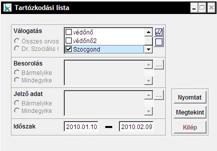 A 'Válogatás' mezőben ki tudjuk választani, hogy mely praxisra kérjük a listát, majd adjuk meg az 'Időszakot' (jobb egérgombbal a mezőre kattintva naptár funkciót kapunk segítségül). Az Élelmezést és a Tartózkodást is össze tudjuk vetni a kapott lista alapján.