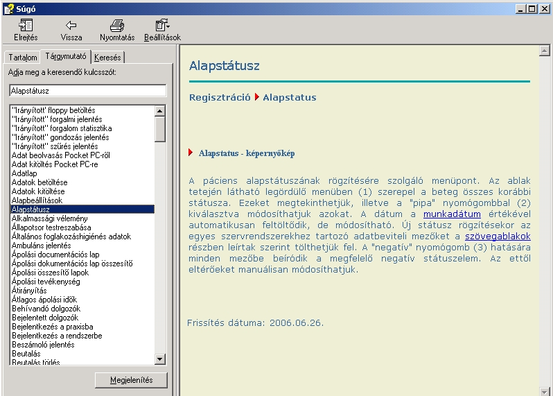 A tárgymutató hasonlóan a Tartalomhoz, a program megismerését hívatott segíteni. Itt is a bal oldalon felsorolt kulcsszavak, kifejezések között kell választanunk a számunkra éppen aktuálisat. Ezt a kulcsszónak a kereső mezőbe történő begépelésével is megoldhatjuk. Itt csak annyi a különbség, hogy miután kiválasztottuk a szükséges témát, akkor az ablakrész alján látható 'Megjelenítés' nyomógombra kell kattintanunk a leírás részleteinek olvasásához. |