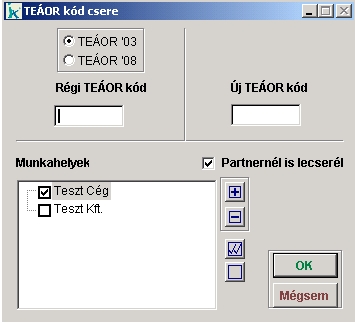 Ebben a menüpontban a 'Régi TEÁOR kódot' mezőben megadott kódot tudjuk lecserélni egy az 'Új TEÁOR kód' mezőben megadott kódra.