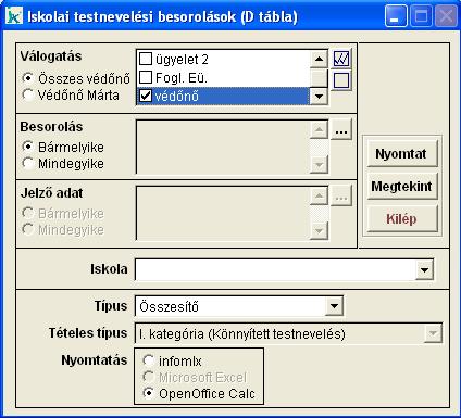 Ebben a menüpontban a testnevelési besorolás listát készíthetjük el. Kiválaszthatjuk,
