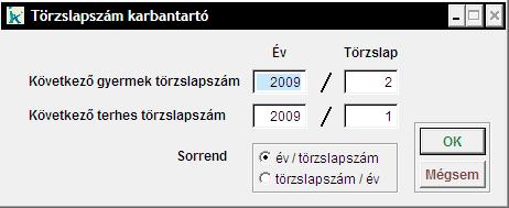 A következő kiadandó gyermek és terhes törzslapszámot állíthatjuk be ebben a menüpontban. A 'Sorrend' mezőben beállíthatjuk, hogy az év vagy a törzslapszám szerepeljen elől (terhes gondozásba vétel, gyermek gondozásba vétel menüpontokban). Az 'OK' gombbal menthetjük a változásokat és bezárjuk az ablakot, a 'Mégsem' gombbal mentés nélkül zárjuk be az ablakot. |