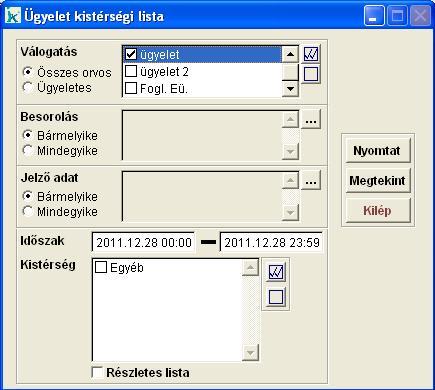 a beteglátogatásokat és a tanácsadásokat listázhatjuk ki, a kiválasztott kistérségekre (ezeket a 'Kistérség' mezőben, a többes választék segítségével választhatjuk ki). A 'Részletes lista' opció segítségével a beteg nevek is szerepelnek a listában. Kistérséget az Ügyeleti ellátáskor (12) tudunk rögzíteni a beteghez. A 'Válogatás' keretben figyeljünk a bejelölt mezőre, mely orvos(ok)ra készítjük el a listát.