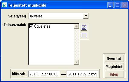 a menüpontban a teljesített munkaidőket (óra, perc pontossággal) tudjuk kilistázni. A programba való bejelentkezés (Bejelentkezési dátum - idő) és a programból való kijelentkezés (Kijelentkezési dátum - idő) alapján számolja a rendszer a munka időtartamát.