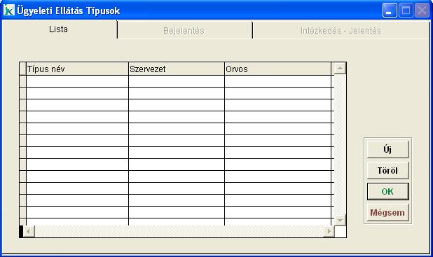 A ügyeleti ellátás során használható (az adminisztrációt gyorsító) Típus ügyeleti ellátások karbantartását végezhetjük el ebben a menüpontban. Új típusellátást az Új nyomógombbal tudunk készíteni, a már meglévők közül, a megfelelőt kiválasztva a listából Töröl nyomógombbal lehet azt eltávolítani, illetve a kijelölés után, 'Bejelentés' és 'Intézkedés - Jelentés' fülre kattintva lehet a tartalmát módosítani. |