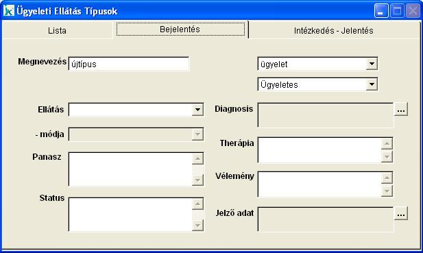 Ha az 'Új' gombra kattintunk, a program automatikusan a 'Bejelentés' fülre vált a program. Itt megadhatjuk ennek a típusnak a megnevezését, ezt fogjuk az ügyeleti ellátás közben a választásnál a listában látni. Megadható, hogy ezt a típust mely szervezet, illetve orvos(ok) használhatják. A képernyő alsó részén látható adatok kitöltése megegyezik a Ügyeleti ellátásban leírtakkal. Ehhez hasonlóan kell kitöltenünk az 'Intézkedés - Jelentés' fül mezőit is. A beírt adatok tárolásához vissza kell térni a 'Lista' fülre, és ott az 'OK' gombbal zárni az ablakot. |