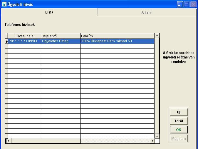 Új ügyeleti hívás rögzítéséhez kattintsunk az 'Új' gombra. A 'Töröl' gomb segítségével törölhetünk tévesen felvett hívásokat.