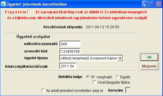 Ez a menüpont az ügyeleti jelentések összefésülésére szolgál. A megfelelő adatok megadása után, a program bekéri sorba a jelentéseket, elkészíti az összefésült jelentést, valamint a hozzá tartozó kísérőjegyzéket. A Betöltést elvégezhetjük Floppy-ról vagy más, Egyéb helyről. A kísérőjegyzéket kérhetjük fájlba is, így az nem kerül nyomtatásra. |