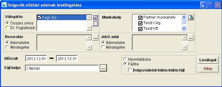 Megadható, hogy a leválogatott adatokat páciensenként külön-külön vagy egy összegző fájlba tegye. A Leválogat gombbal indítsuk az adatok mentését, a Kilép gomb segítségével zárjuk be az ablakot.