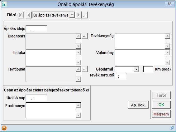 mezőben. A Háziorvosi ellátás ablakról tudunk Ápolás ideje, vélemény, gépjármű és távolság adatokat átemelni abban az esetben, ha ott ki van töltve, valamint az Ápolási tevékenység ablak jobb alsó sarkában található
