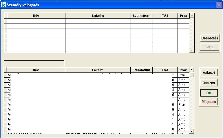 A besorols segítségével egyszerre több pácienst is beemelhetünk, így nem kell egyenként a 'Választ' gomb segítségével beemelnünk a pácienseket a felső táblázatba. Besorolhatunk például egy iskolai osztályt egy csoportba, így a Besoroloás gomb megnyomásakor kiválaszthatjuk a csoportot, így az összes a csoportba tartozó páciens beemeli a program. Besorolni a pácienst egy csoporta a Törzskarton menüpont Besorolás mezőjében tudunk. |