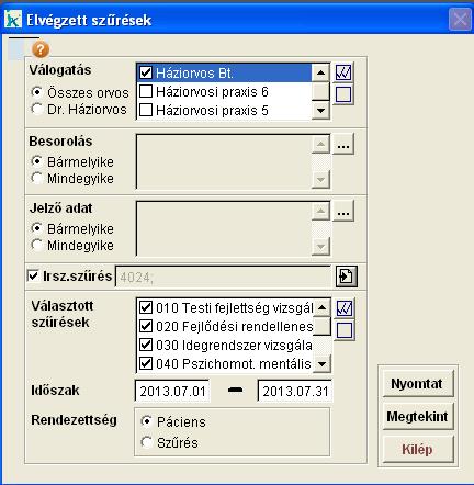 A válogatás mezőben megadható, hogy mely orvos(ok)ra és mely praxis(ok)ra kérjük a lista