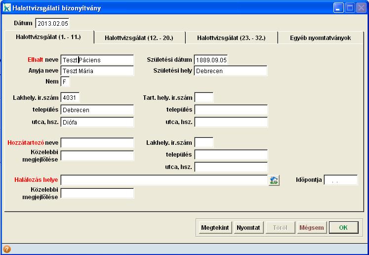 ikonra kattintunk, akkor a program a páciensünk lakcímét automatikusan beemeli a halálozás helyébe. Ha a második fülön