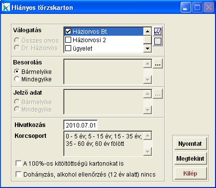 A válogatás mezőben megadható, hogy mely orvos(ok)ra és mely praxis(ok)ra kérjük a lista elkészítését. Alapból az 'Összes orvos' van kiválasztva, de ez szűkíthető az éppen aktuálisan bejelentkezett orvosra, ehhez az orvos nevet kell kiválasztanunk. Praxisból többet is választhatunk, a listáztatni kívánt neve elé kell pipát raknunk.