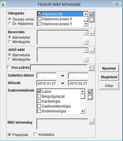 A válogatás mezőben megadható, hogy mely orvos(ok)ra és mely praxis(ok)ra kérjük a lista