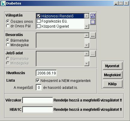 A lista egy kimutatást ad a Diabetes gondozottak 'gondozási eredményességéről'. A megadott hivatkozási dátumot alapul véve megjeleníti azon értékeket, melyek segíthetnek egy átfogó képet kapni a gondozott paciensek közül mekkora azon személyek aránya akiknél sikerült illetve nem sikerült a célértéket elérni a nyilvántartott gondozási folyamat alatt (célértékek a lista alján láthatók). Az ablakban kérhetjük, hogy a listát még a megelőző hány év adataival bővítse a program. Így még jobban kitűnhet a változás iránya és mértéke. Lehetőségünk van azon gondozott személyek listáját is kérni, akik nem jelentek meg gondozáson. A lista megfelelő megjelenítéséhez meg kell adnunk, hogy mi a neve a mi programunkban a Vércukor és a HBA1C vizsgálatoknak. Ezen összerendeléseket csak egyszer kell megcsinálni a megfelelő mezőn történő jobb egérklikk hatására megjelenő laborvizsgálatok közül történő kiválasztással. |
