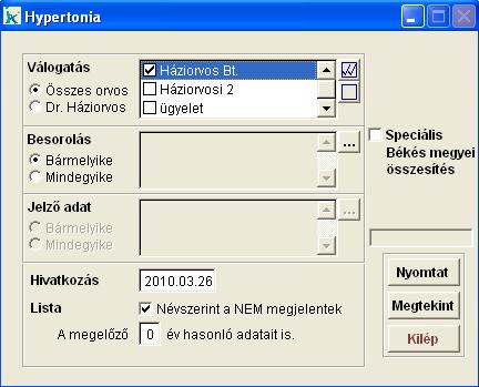 A lista egy kimutatást ad a Hypertonia gondozottak 'gondozási eredményességéről'. A megadott hivatkozási dátumot alapul véve megjeleníti azon értékeket, melyek segíthetnek egy átfogó képet kapni a gondozott paciensek közül mekkora azon személyek aránya akiknél sikerült illetve nem sikerült a célértéket elérni a nyilvántartott gondozási folyamat alatt (célértékek a lista alján láthatók). Az ablakban kérhetjük, hogy a listát még a megelőző hány év adataival bővítse a program. Így még jobban kitűnhet a változás iránya és mértéke.