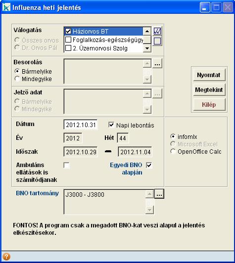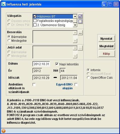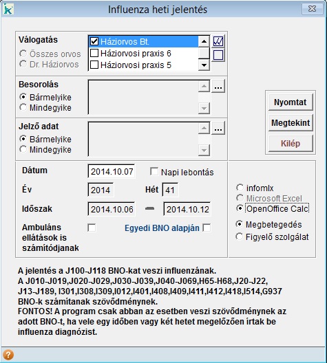 Az influenza figyelő szolgálatba beválogatott praxisoknak egy excel táblázatot kell jelenteni. Ez a táblázat elérhető az Influenza heti jelentésben. Ha nem az infomIx-es leválogatást választjuk, akkor megjelenik egy újabb lehetőség, ahol megadható, hogy a Megbetegedés-re vagy a Figyelő szolgálatra való excel táblázat készüljön el. Ahhoz, hogy a Microsoft Excel vagy az OpenOffice Calc formátumot ki tudjuk választani, ahhoz ezeknek a programoknak fel kell lenniük telepítve a számítógépre. Amelyik program fel van telepítve, csak azt tudjuk kiválasztani, majd ezután jelennek meg a Megbetegedés és a Figyelő szolgálat lehetőségek. Mivel a figyelő szolgálatba bevont praxisoknak nem csak a konkrét megbetegedést kell jelenteni, hanem az esetleges tünetek alapján annak ítélt megjelenést is, javasoljuk, hogy az ellátás során felvehető Jelző adatot használjuk erre a célra. Így egyszerűen megjelölhető az ellátás, pl. Influenzaszerű megbetegedés. Így a Jelző adat mezőben megadható, hogy az „Influenzaszerű megbetegedés” jelzőadatos ellátásokat gyűjtse ki a program A Megtekint gomb megnyomására készíti el a program a kiválasztott jelentést. Miután elkészült a kiválasztott programba a lista, ezután tudjuk elmenteni, majd a megfelelő szerv részére eljuttatni. |