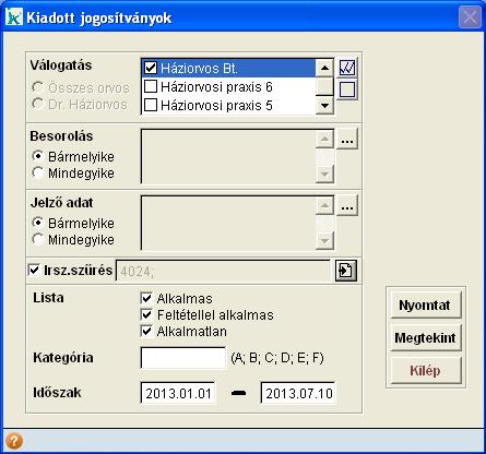 A válogatás mezőben megadható, hogy mely orvos(ok)ra és mely praxis(ok)ra kérjük a lista