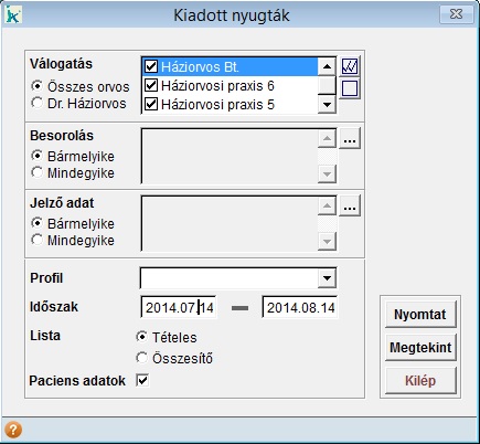 válogatás mezőben megadható, hogy mely orvos(ok)ra és mely praxis(ok)ra kérjük a lista elkészítését.