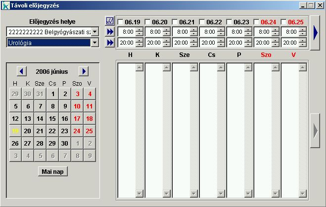 A menüponton keresztül indíthatjuk el az előjegyzést más, elérhető, kapcsolódó 'társrendszerbe'. A távoli előjegyzésen keresztül a bennünket érdeklő időpontokra lekérhetjük a megadott szakrendelés kiválasztott eszközére/vizsgálatára a szabad időpontokat, és azokból választhatunk, foglalhatunk. Első lépésben ki kell választanunk az előjegyzés helyét. Csak azon 'helyek' közül választhatunk, akiket mint szolgáltatókat felvettünk a rendszerünkbe, a kommunikáció szolgáltatók karbantartásánál. Utána a vizsgálat/eszköz kiválasztásával kell folytatnunk. Itt is csak a kommunikáció vizsgálatok karbantartásánál berögzített elemek látszanak. Következő lépésben egy napot választunk a naptárból. Ezzel a nappal kezdődően jelenik meg a képernyőn 7 napi dátum, melyek közül az előtte lévő négyzeten kattintva jelölhetjük ki a bennünket érdeklő napot. A nap alatt akár azt az időintervallumot is megadhatjuk, melyre vonatkozóan érdekelne bennünket a szabad helyek listája. Miután kijelöltük a napokat és megadtuk az időpontokat, a kérést az ablak jobb oldalán látható nyomógombra kattintva küldhetjük el. A kommunikáció sebességétől függően, néhány másodperc után a napok alatt található oszlopokban megjelenik a kérésnek megfelelő, még szabad, foglalható időpontok listája. Ebből a leginkább megfelelőt kiválasztva a foglalást, előjegyzést az ablak bal oldalán található nyomógombra kattintva küldhetjük el. Az ablakot a jobb felső sarkában található 'X' záró nyomógombbal csukhatjuk le. |