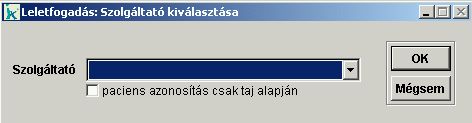 A programba itt érkeztethetjük más, távoli 'társ rendszerből' az ott előállított leleteket. A kommunikáció - szolgáltatók karbantartása menüpont alatt felvett szolgáltatók listájából választhatunk egyet, akinek az adatit fogadni kívánjuk. Megjelölhetjük, hogy a paciens azonosítás csak TAJ szám alapján történjen. |