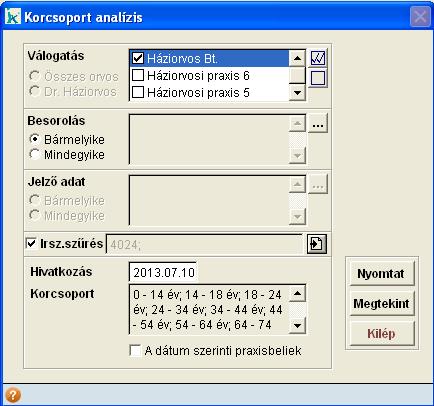 A válogatás mezőben megadható, hogy mely orvos(ok)ra és mely praxis(ok)ra kérjük a lista elkészítését. Alapból az 'Összes orvos' van kiválasztva, de ez szűkíthető az éppen aktuálisan bejelentkezett orvosra, ehhez az orvos nevet kell kiválasztanunk. Praxisból többet is választhatunk, a listáztatni kívánt neve elé kell pipát raknunk.