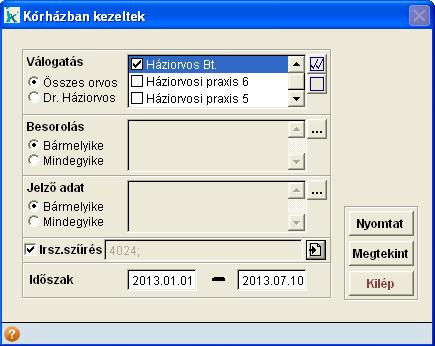 A válogatás mezőben megadható, hogy mely orvos(ok)ra és mely praxis(ok)ra kérjük a lista