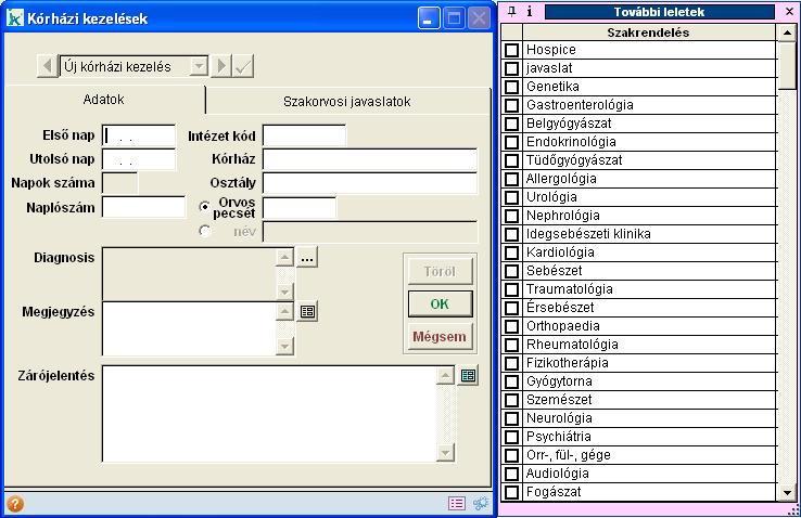 kórházi kezeléseinek és zárójelentéseinek rögzítésére alkalmas menüpont. A