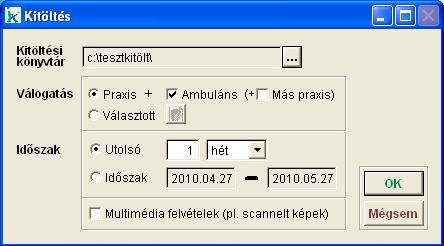 A háziorvosi programhoz kapcsolódó Mobil Praxis program számára adhatunk át adatot ezen a menüponton keresztül. Az átadási útvonal megadása a 'három pontos' választó gombon keresztül kerül meghatározásra. Itt lehetőségünk van egy helyi átadási könyvtár kiválasztására, vagy esetleg egy a hálózaton keresztül a géphez kapcsolt pl. notebook-on található könyvtár megadására. Helyi átadás esetén, a kitöltési könyvtár ezen a számítógépen található, ekkor a leválogatott adatokat egy adathordozó (CD, pendrive) segítségével kell eljuttatni a mobil praxis gépére. A kitöltési könyvtár nem lehet a programkönyvtár (VISUALIX) és annak alkönyvtárai sem. A kitöltendő adatok meghatározására szolgál a többi mező. A válogatás mezőben lehet azt meghatározni, hogy a teljes praxis és ambuláns állomány is leválogatásra kerüljön, vagy csak a választott személyek. Amennyiben ez utóbbit választjuk, a megjelenő paciens választó ablakban kiválasztott paciensek adatai kerülnek kitöltésre. Ha a rendszerben több praxis is található, lehetséges, hogy mobil praxisba való kitöltéskor az ambuláns betegek mellett, a 'Más praxis' paciensei ne töltődjenek ki. Az időszak mezőben kell megadnunk, hogy az adatok mely időszakra vonatkozó része kerüljön át a Mobil Praxis programba. Megadhatjuk az utolsó 7 napot, 3 hetet, 2 hónapot vagy 1 évet is akár. A kitöltést kérhetjük adott dátumtól- dátumig meghatározással is. A kijelölt paciensek személyi adatai, adott időszakra eső ellátási adatai kerülnek leválogatásra az OK gombonm történő kattintás hatására. |
