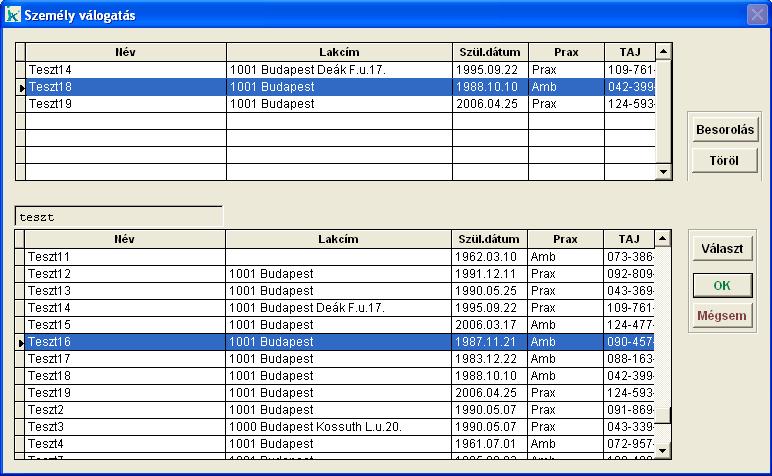 A megjelenő ablakban válasszuk ki a 'Kitöltési könyvtár'-at. Ebbe a könyvtárba a leválogatott adatok fognak kerülni. A 'Válogatás' keretben a 'Praxis' választógomb bejelölésével teljes praxisunkat és amennyiben kijelöljük Ambuláns pacienseket is áttölthetünk, míg a 'Választott' bejelölésével tetszőlegesen kiválasztott pacienst, pacienseket válogathatunk le. Ebben az esetben a '...' gombra kattintva kapjuk ezt az ablakot: |