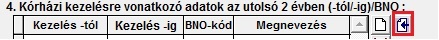 Segítségként a Kötelező II. (1) fülön a kórházi kezelésre vonatkozó adatok megadásánál több BNO is megadható (A BNO mezőre jobb egérgombbal kattintva). Ekkor, ha adtunk meg dátum intervallumot, akkor az, az összes kiválasztott BNO-hoz beemelődik. Az 'Egyéb megbetegedések (BNO észlelés ideje)'-re vonatkozó adatok megjelenítésekor, az adatok az észlelés sorrendjében jelennek meg. A sorrendiséget megváltoztató le –és fel nyilak nem jelennek meg ebben az esetben. |