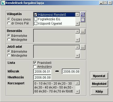 A válogatás mezőben megadható, hogy mely orvos(ok)ra és mely praxis(ok)ra kérjük a lista