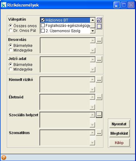 Azon személyek listáját kérhetjük a képernyőre illetve nyomtatásba, akiknek a személyi adatai között (háziorvosi anamnézisben megadott rizikó értékek) a listaablakban megjelölt kiemelt rizikó, életmód, szociális helyzet, szomatikus állapot adatok szerepelnek.