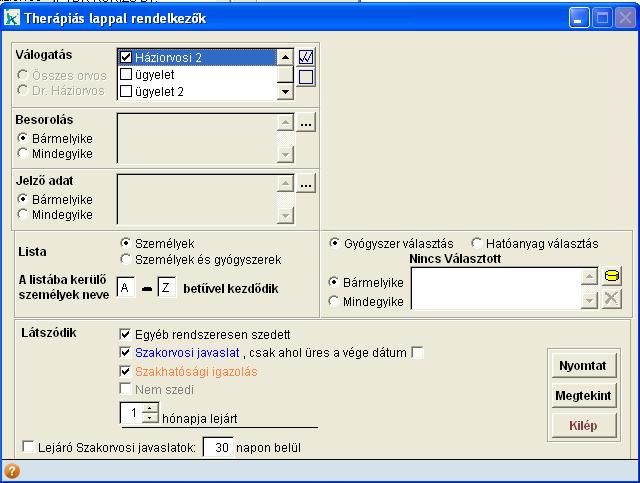 Beállítható, hogy az egyéb rendszeresen szedett, szakorvosi javaslat, szakhatósági igazolás, nem szedi csoportokból mely készítmények kerüljenek bele. A szakorvosi javaslatok esetében külön megadható, hogy csak azon javaslatok látszódjanak, ahol nincs kitöltve a vége dátum.