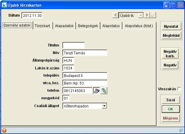 alapstátusz is képződik. Negatív státuszt is be tudunk emelni az Újabb törzskartonba a 'Negatív' gomb segítsgével, valamint ezeket a Negatív státuszokat karban is tudjuk tartani a 'Negatív karb.' gomb megnyomásával.
