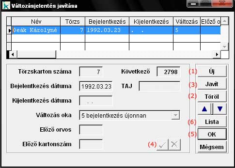 A program a betegek regisztrációját (bejelentkezés, kijelentkezés, kártyacsere) folyamatosan dokumentálja a havi TB változásjelentéshez. Ebben a menüpontban lehetőségünk van a regisztráció manuális megváltoztatására (pl. a bejelentkezés dátumának módosítására). A képernyőn megjelenik a beteg eddigi összes regisztrációja (bejelentkezés, kijelentkezés). Ha egy új regisztrációt szeretnénk a listába elhelyezni, akkor azt az "új" nyomógombbal (1) tehetjük. Ilyenkor az új regisztráció az aktuális sor elé íródik be. Ha egy létező regisztrációt törölni akarunk, akkor a törlendő sor kiválasztása után nyomjuk meg a "töröl" gombot (2). Egy létező regisztráció módosítását pedig a sor kiválasztása utáni "javít" nyomógomb (3) megnyomásával érhetjük el. Ez utóbbi esetben, illetve az új regisztráció felvételekor szerkeszthetővé váló alsó ablakrészben van lehetőség az egyes mezők módosítására. Ezt a "pipa" nyomógombbal (4) érvényesíthetjük. A jelentésjavítás lezárásakor (5) a program ellenőrzi, hogy nincs-e logikai ellentmondás az új regisztrációs listában (pl. két bejelentkezés, több kijelentkezés, mint bejelentkezés stb.). A "lista" nyomógombbal (6) képernyős listán megtekinthetjük az adott beteg regisztrációit. |