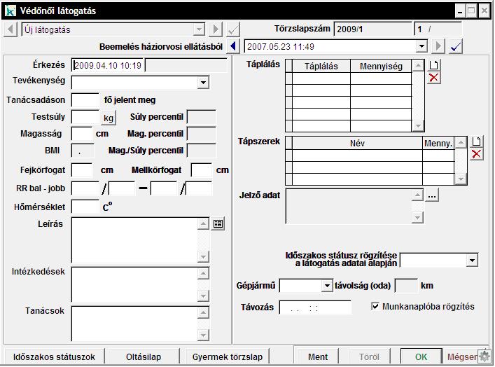 Háziorvosi ellátás ilyen nevű többes választék mezőjével. Az Időszakos státusz rögzítése a látogatás adatai alapján mezőben, ha kiválasztjuk a megfelelő korú státuszt, akkor a megfelelő adatok átkerülnek a kiválasztott státuszba. Megadható a