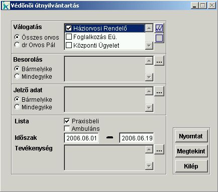 A védőnői útnyilvántartást készíthetjük el ebben a menüpontban, a megadott időszakra vonatkozóan. A tevékenység mezőben többes választás szerint beállítható, hogy mely tevékenységeket vegye figyelembe a program a lista elkészítéséhez. |